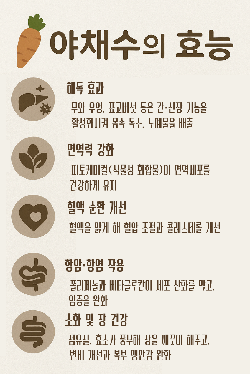 야채수는 무, 당근, 우엉, 표고버섯, 시래기(혹은 무잎) 다섯 가지 재료로 만든 자연 해독수예요.